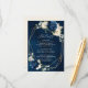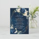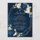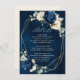 Dark navy blue floral wedding details card featuring elegant bouquet of navy blue, royal blue , white , gold, champagne ivory, blush colour rose , hydrangea, ranunculus, peony, flower buds and sage green eucalyptus leaves and elegant watercolor with round glitter geometric neutral frame. Please contact me for any help in customization or if you need any other product with this design.