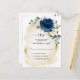 Dark navy blue floral wedding RSVP Postcard featuring elegant bouquet of navy blue, royal blue , white , gold, champagne ivory, blush colour rose , hydrangea, ranunculus flower buds and sage green eucalyptus leaves and elegant watercolor with round glitter geometric frame. Please contact me for any help in customization or if you need any other product with this design.