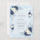 This design features a sophisticated palette of deep navy and crisp white roses paired with soft watercolor foliage. The light blue background creates a serene and elegant atmosphere perfect for a formal event. Delicate anemones and silver dollar eucalyptus leaves add a touch of botanical grace. This aesthetic is ideal for a cool-toned nuptial.