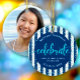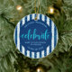 This personalized photo ornament is a wonderful keepsake for your favourite grad or her family members. The front boasts stunning, modern, sparkly faux turquoise glitter handwritten script calligraphy on a navy blue and white striped background with faux turquoise glitter confetti dots. Personalize the custom text with your grad’s name, high school, and class year. Her custom photo is on the back. Choice of ceramic, metal, glass or premium metal frame materials and a circle or square shape. Matching invites, thank you cards, cap toppers, napkins, plates and other graduation goodies are also available in this trendy and stylish collection. Guaranteed to preserve cherished memories of her special occasion!