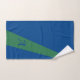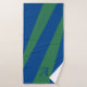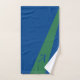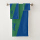 Trendy abstract green and navy blue stylish geometric colour block bath towel set personalized with your monogram and name.