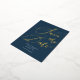 Elegant save the date postcard featuring hand written calligraphy text in gold on a navy blue background.