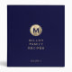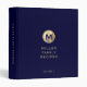 Modern recipe binder features a brushed gold metallic monogram on a classic navy blue background. Custom family name presented in the centre in stylish simple classic block typography with a complimentary metallic gold monogram medallion.