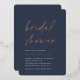 Invite guests to celebrate the bride to be with these modern and minimal bridal shower invitations with stunning rose gold foil accents. Simple design features "bridal shower" in casual handwritten script on a soft navy blue background, with your event details aligned at the lower left in modern off white lettering.