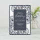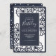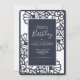 A crisp laser cut floral pattern in navy and white frames the navy blue text box of this beautiful, modern, Birthday invitation. Navy Blue with scattered polka dots on the reverse. Perfect for any age, this crisp, bold invitation was made for your next big birthday party.