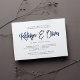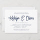 Our elegant, modern wedding rehearsal dinner or cocktail party invitations in chic navy blue and white feature your names in handwritten script typography. Personalize with your ceremony rehearsal and rehearsal dinner details beneath. Includes space for the rehearsal timing and church or venue address. Cards reverse to solid navy blue. A chic design in classic navy and white for modern couples and elegant events.