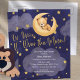 The "Over the Moon Teddy Bear Twinkle Little Stars" baby boy shower invitation beautifully melds dreams with a touch of celestial serenity. It features a watercolor depiction of a teddy bear in slumber on a crescent moon, surrounded by a gentle constellation of stars, capturing the essence of a peaceful childhood. The design is set against a navy blue backdrop, enhanced with an abstract watercolor texture and soft clouds, offering a tranquil and welcoming vibe for your announcement. Perfect for celebrating the arrival of a baby boy, this invitation is sure to charm your guests and set a magical mood for the baby shower.
