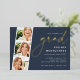 Celebrate their big milestone with these chic foil invitations that are perfect for a graduation celebration. Luxe design features "grad" in elegant gold foil on a rich navy blue background. Personalize with your party details aligned at the right in modern white lettering. Finish the design with three square photos of the graduate in a photo strip layout.