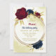 Beautiful birthday party invitation featuring dark navy blue and red flowers and gold leaves .
