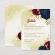 Beautiful wedding reception details enclosure card featuring dark navy blue and red flowers and gold leaves .