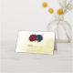 Beautiful wedding place card featuring dark navy blue and red flowers and gold leaves .