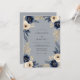 This design features deep navy roses and creamy white peonies set against a muted slate gray background. Shimmering gold foliage accents the rich floral arrangement, creating a sophisticated and regal aesthetic. The color palette is perfect for a formal winter ceremony.