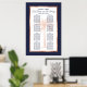 Add your own special touch to this elegant design featuring modern script and navy blue text including an artistic rose gold palm tree silhouette with a metallic rose gold copper frame on the front. This seating chart design features the bride and groom's names along with the words "Eat, Drink, and Be Merry" and "Please Find Your Seat". Templates are provided for up to eight tables with up to 10 or 11 names per table.