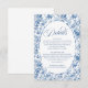 Elevate your celebration stationery with this French Toile de Jouy roses details card in elegant navy blue, royal blue, dusty blue, and deep blue tones. Featuring delicate floral artwork and refined script typography, this enclosure card or insert adds timeless charm to your suite. Perfect for sharing event information in a coordinated, sophisticated style.