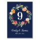 Rustic romantic style wedding table number cards feature a stylish monogram with numbers framed by a floral watercolor wreath with beautiful roses, dahlias, peony flowers, and greenery, in a gorgeous autumn palette of burgundy red, golden yellow, peach orange, blush pink, and shades of green. Rich navy blue background colour.