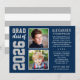 Invite friends and family to celebrate with this modern navy and silver gray graduation open house invitation featuring a bold vertical 2026 year and a clean two-photo layout. Personalize the graduate name, school, class year, and party details, plus optional wording for future college plans. The varsity “GRAD” lettering paired with script “class of” gives it a sporty, classic feel while staying easy to read. Perfect for high school or college graduation open houses and parties.