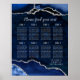 Guide your guests in style with this elegant wedding seating chart featuring a navy blue agate marble design accented with luxurious silver details. The bold geode-inspired background creates a dramatic and sophisticated look, perfect for fall and winter weddings, formal celebrations, or glamourous evening events. Designed for up to eight tables, the layout keeps names organized and easy to read while complementing the organic agate texture. Ideal for couples seeking a stylish and unique wedding display, this seating chart blends natural stone aesthetics with a refined, modern layout. Easily personalize all text to match your wedding details and create a beautiful focal point for your reception.