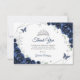 Navy silver and white floral Quinceanera thank you card. Features, script font, silver butterflies, watercolor roses and tiara. Perfect for an elegant princess style glam celebration. Personalize with your own details.