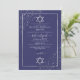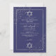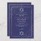 This elegant and modern Bat Mitzvah invitation is ideal for a classy and formal event. It features a faux printed sparkly silver glitter confetti sprinkled on the corners over a thin silver rectangle border with a navy blue background with stars of David. It's chic, luxurious, pretty, simple, and trendy; the perfect design for your special day.