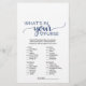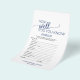 This navy simple calligraphy "what's in your purse" game is perfect for an elegant bridal shower. The front of the game card features "how well do you know the bride", and the back of the card features "what's in your purse". The white and blue design features chic rustic typography and a lovely romantic heart. Personalize the front of the card with the brides name and bridal shower date.