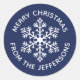 A white snowflake on a navy blue background with "Merry Christmas" from the family around it.