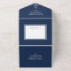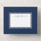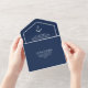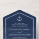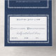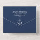 Elegant all in one wedding invitation in navy blue with white rope frames and a white anchor and elegant fonts for a nautical wedding.