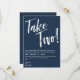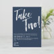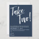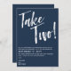 Charming postponed wedding save the new date card in navy blue with white text. Take Two! is written in a brush script across the top of the card. Write your new wedding date and additional information beneath in a modern font.