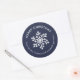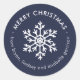 Affordable custom printed Merry Christmas round gift tag stickers personalized with your text. This simple modern holiday design features a white snowflake on a navy blue background. Use the design tools to choose any background colour, edit text fonts and colours or upload your own photos to design your own unique holiday gift labels, envelope seals or stickers.