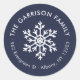Affordable custom printed round return address stickers personalized with your family name and return address. This simple modern holiday design features a white snowflake on a navy blue background. Use the design tools to choose any background colour, edit text fonts and colours or upload your own photos to design your own unique holiday return address labels, envelope seals or gift tag stickers.