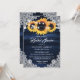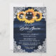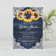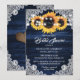 Elegant rustic navy blue and sunflower bridal shower invitation featuring sunflower flowers, burlap hearts, delicate floral lace and string lights against a rustic wood background. Matching items available.