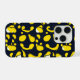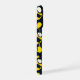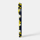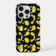 This iPhone case features a deep navy background accented with playful yellow and white organic shapes, creating a lively, contemporary abstract pattern.