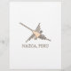 A newsprint version of the famous Nazca Lines Hummingbird geoglyph. Design in orange, black and white. Text: Nazca, Peru.