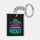 Texte de rose vif, bleu vif et blanc avec des rondelles de hockey et des bâtons de hockey : Ne sous-estimez jamais une fille qui joue au hockey, parfait pour le joueur de hockey de tous les âges qui aime le sport!
