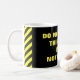 Les caractéristiques de conception ce la demande, "NE TOUCHENT PAS CETTE TASSE ! ELLE N'EST PAS À VOUS !". Elle comporte également les rayures noires et jaunes.