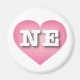 This magnet features a pink heart with a white-washed centre containing the bold, white, upper case letters NE, the official abbreviation of Nebraska, the cornhusker state.