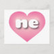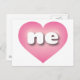This card features a pink heart with a white-washed centre containing bold, rounded, white lower case letters ne, a playful version of the abbreviation for Nebraska, the cornhusker state. The card is blank inside awaiting your customized text or handwritten sentiments.