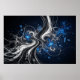 A frozen cosmic storm: silver and black fluids intertwine in dynamic spirals, while floating blue crystal shards and stellar cores evoke star births. Hyper-detailed digital art merging chaos and order—ideal for visionary and tech-forward brands.