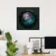 Colourful view of outer space as seen through a steampunk style heavily bolted porthole.