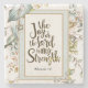 Inspirational quote scripture stone coaster depicts a rustic garden floral watercolor design with white flowers, eucalyptus and blue leaves. It features an encouraging Bible Verse Nehemiah 8:10, "The joy of the lord is my strength."