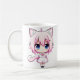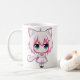 An anime style cat girl with a chibi and adorable look. Her skin is soft and her hair is a bright pink color that falls in soft waves down to her shoulders. Her pointed ears and furry cat tail identify her as a magical being.