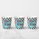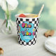 Neon 90's retro Five is a vibe 5th birthday paper cups with hearts, daisies, disco ball and chequered background.