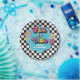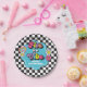 Neon 90's retro Five is a vibe 5th birthday paper plates with hearts, daisies, disco ball and chequered background.