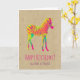 A birthday card with a funky, sixties style psychedelic illustration of a baby zebra in neon colours of bright yellow, hot pink and mint green. Wild and fun with a creative artsy flair. Set on a faux craft paper background. The front says Happy Birthday wild child and the inside of the card has a message which you can customize or leave as is.