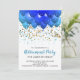 Bleu néon moderne sur invitation de retraite blanche. Ballons et confettis.