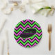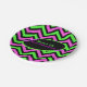 Colourful neon paper plate, with a pink, green, and black chevron zigzag pattern. Graphics of a neon green and magenta framed black oval text area, in the middle of the plate, has neon green and pink text ready to personalize for your event. Matching products are available.