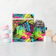 A fun Christmas wrapping paper feature bright blue, yellow, green and pink neon Christmas trees on a black background.
