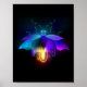 Antique, mechanical firefly with light bulb and thin wings glows orange, purple, turquoise on black background. Steampunk style.