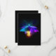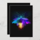 Antique, mechanical firefly with light bulb and thin wings glows orange, purple, turquoise on black background. Steampunk style.