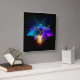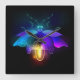 Antique, mechanical firefly with light bulb and thin wings glows orange, purple, turquoise on black background. Steampunk style.