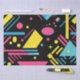 Add a burst of energy to your space with this vibrant geometric pattern! Set against a dramatic black background, this design features a mesmerizing mix of triangles, squares, circles, lines, and stars in yellow, pink, blue, and cyan